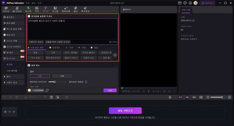 위의 무료 효과음 사이트에서 찾을 수 없는 효과음을 찾고 있다면, 이번 파트에서는 AI를 활용해 효과음 만들기 및 효과음 편집부터 영상 제작까지 한 번에 처리할 수 있는 올인원 프로그램 HitPaw Edimakor를 소개해드립니다. Edimakor는 위에서 소개한 무료 효과음 사이트에서 다운로드한 효과음을 전문적으로 편집할 수 있고, AI로 자체적인 효과음까지 만들 수 있는 프로그램입니다. 특히 효과음을 영상에 자연스럽게 삽입하고 볼륨이나 타이밍을 세밀하게 조정할 수 있어 퀄리티 있는 콘텐츠 제작이 가능하며 한글 지원과 직관적인 인터페이스로 효과음 편집이 처음인 분들도 쉽게 사용할 수 있어서 추천 드립니다.