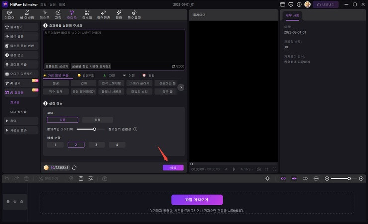 5단계: 만들고 싶은 효과음의 길이, 생성하고 싶은 수량을 선택해주세요. Edimakor의 AI가 프롬프트와 설정 메뉴의 길이 및 생성 수량을 참고하여 자동으로 만들어 주니 최대한 머릿속에 있는 아이디어와 비슷하게 설정해보세요.
