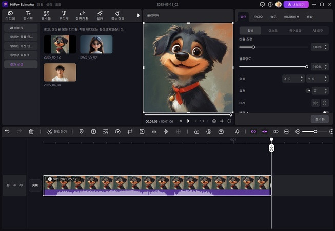 7단계: Edimakor AI가 말하는 강아지 영상을 생성했다면 미리보기로 제대로 적용이 되었는지 확인해주세요. 그리고 만들어진 영상을 편집하고 싶다면 아래의 타임라인으로 영상을 끌어와 주세요.
