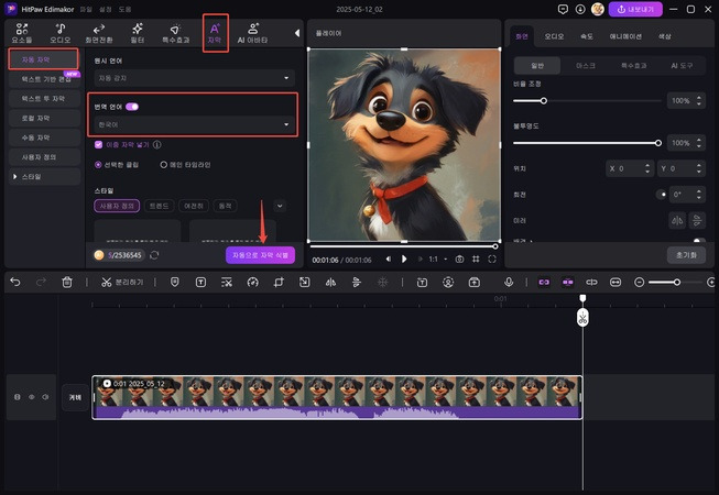 8단계: Edimakor의 또 다른 핵심 기능인 AI 자막은 AI가 자동으로 자막을 바꿔주기 때문에 따로 번역할 필요 없이 상단 메뉴의 ‘자막’ > ‘자동 자막’을 클릭하셔서 번역 언어를 선택하고 ‘자동으로 자막 식별’만 클릭하면 자동으로 자막이 생성되니 눈길을 사로잡는 영상을 만들기 위해 자막도 추가해주세요.